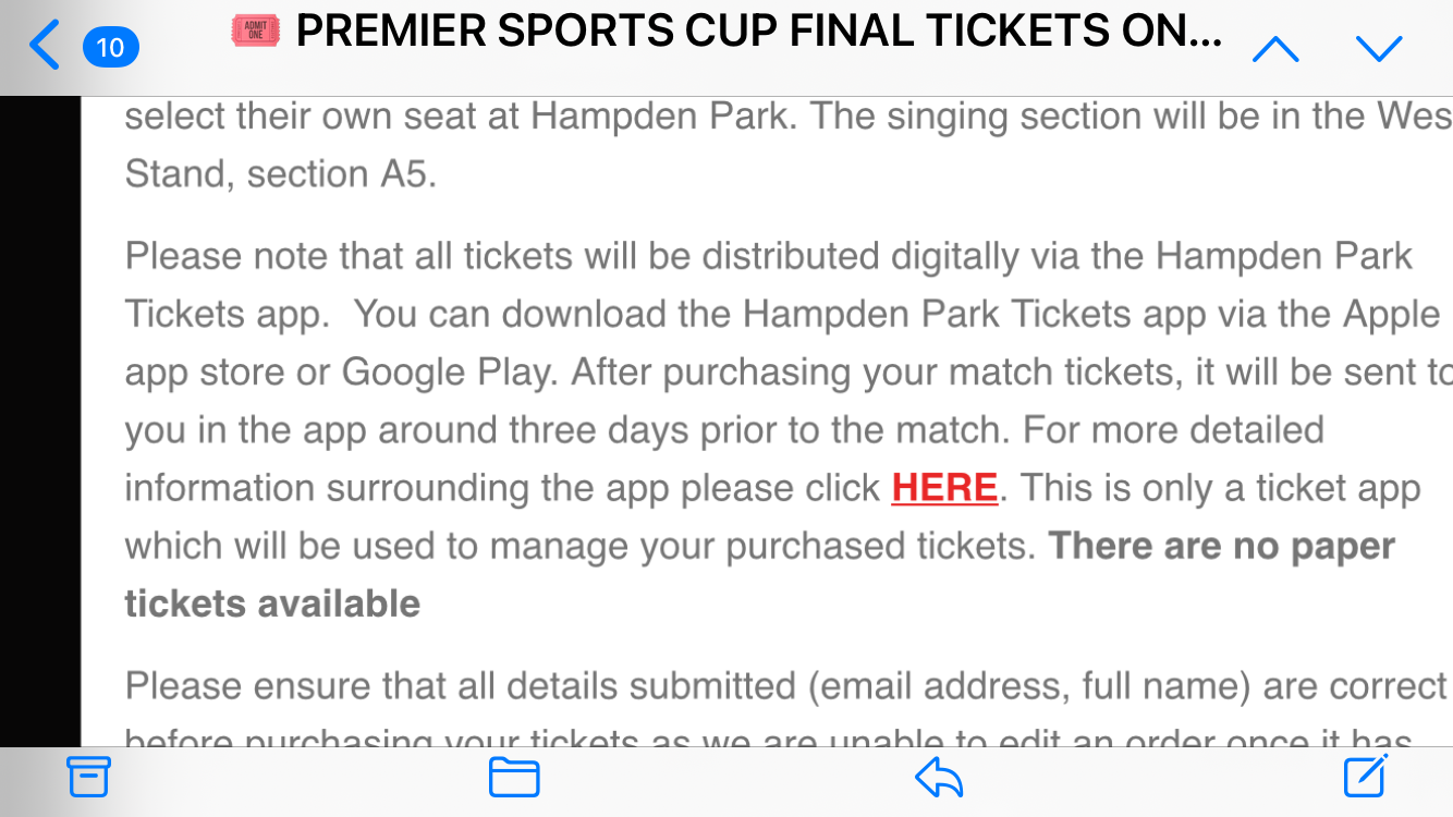 E=Mc2 Posted November 13 Report Posted November 13 On 11/11/2025 at 3:34 PM, stlucifer said: I don't think you can access the tickets on anything but the Hampden app. After the purchase of the tickets the email arrives from St. Mirren saying that the tickets are now on sale. A screenshot from that email below stating only the Hampden app is being used. Quote